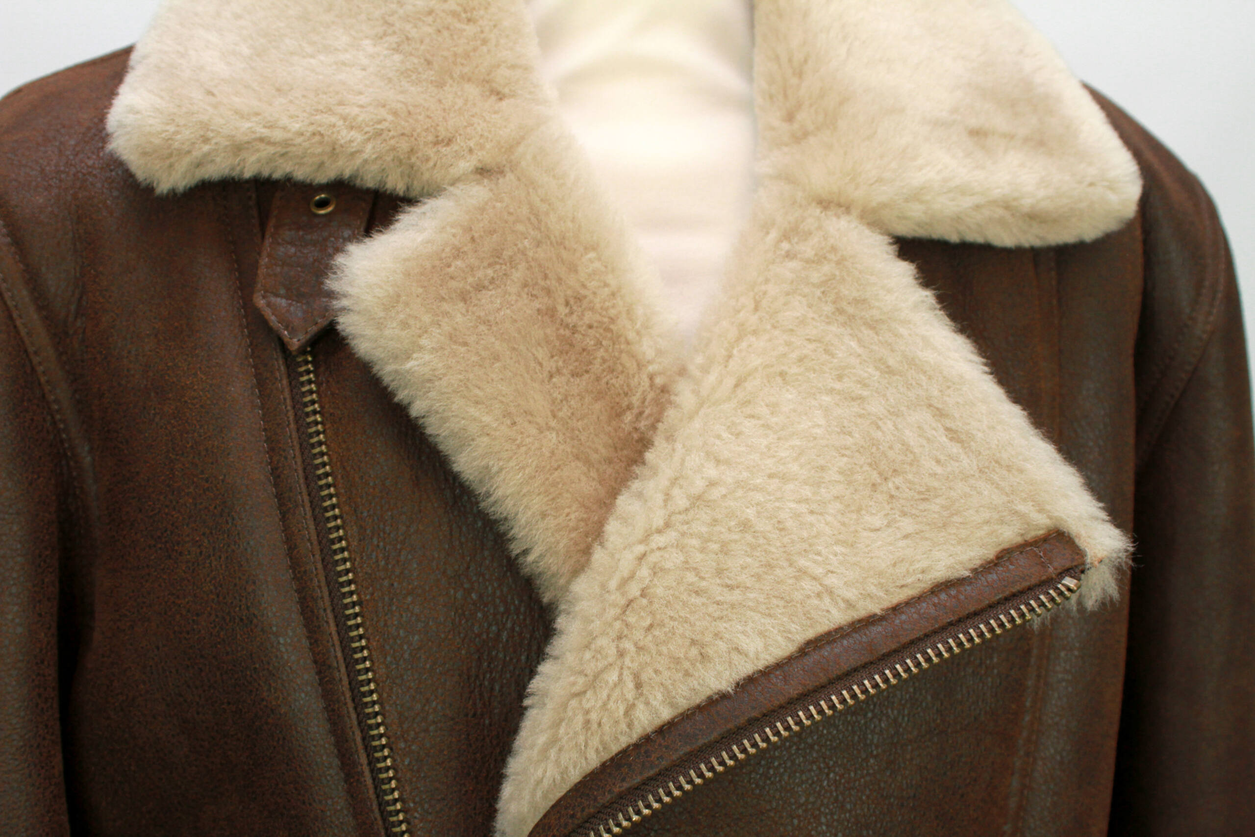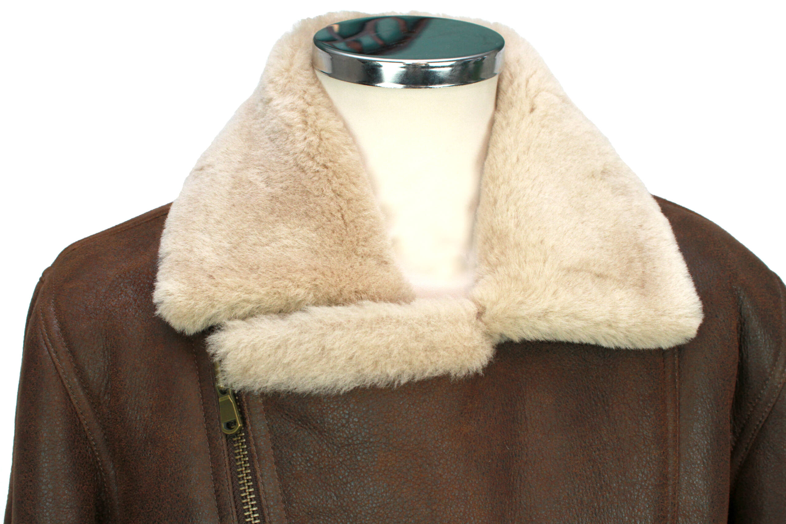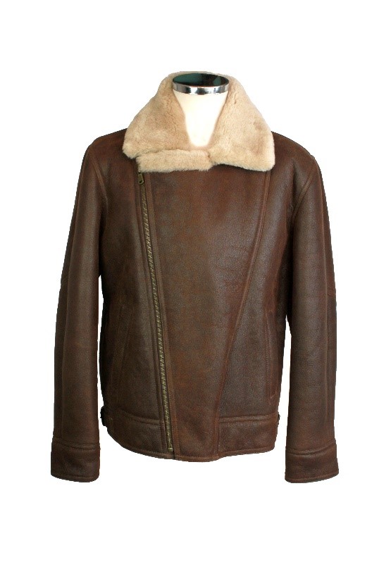 Men’s flying jacket with aviator finished sheepskin, diagonal zip with buckle detail, single welt and angled pockets