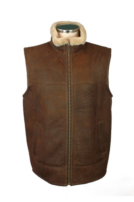 Mens traditional gilet with aviator finished sheepskin, cnetre zip closure and angled single welt pocket