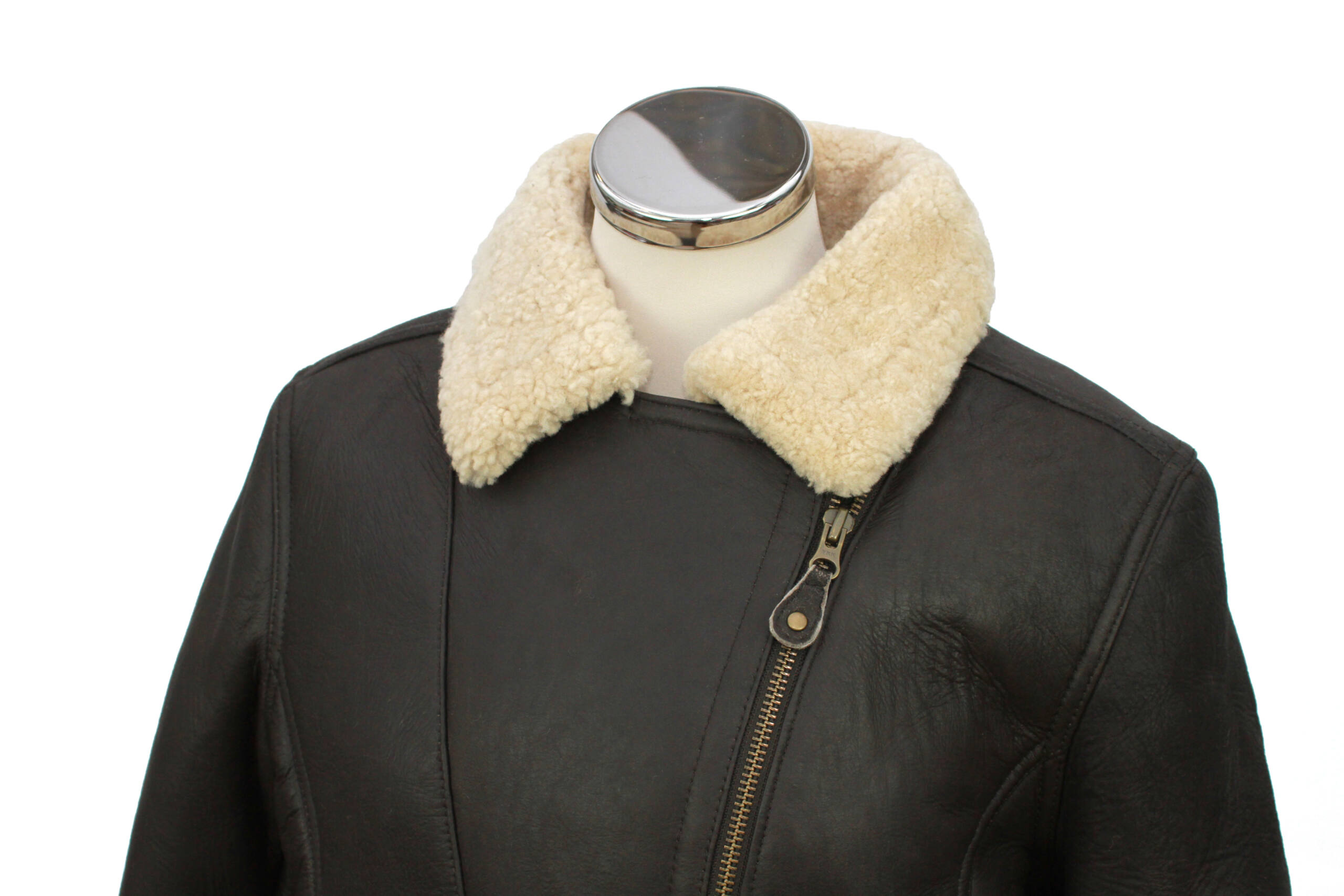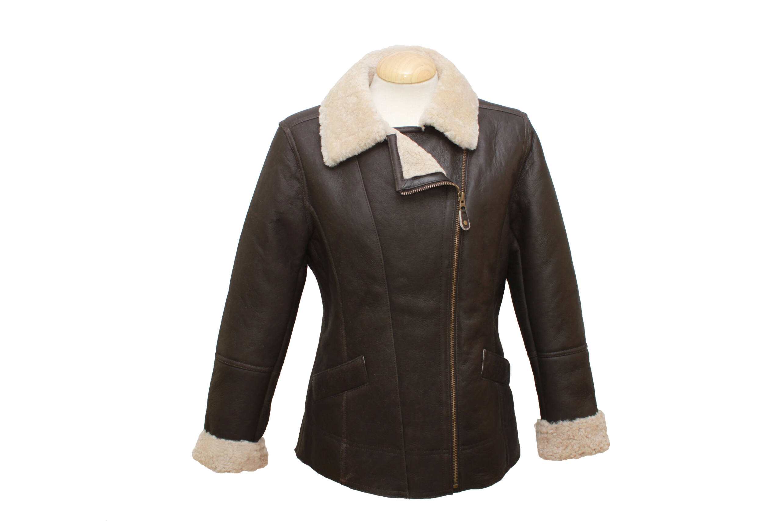 Aviator finished ladies sheepskin flying jacket, diagonal zip with buckle detail, singled welt and angled pockets.